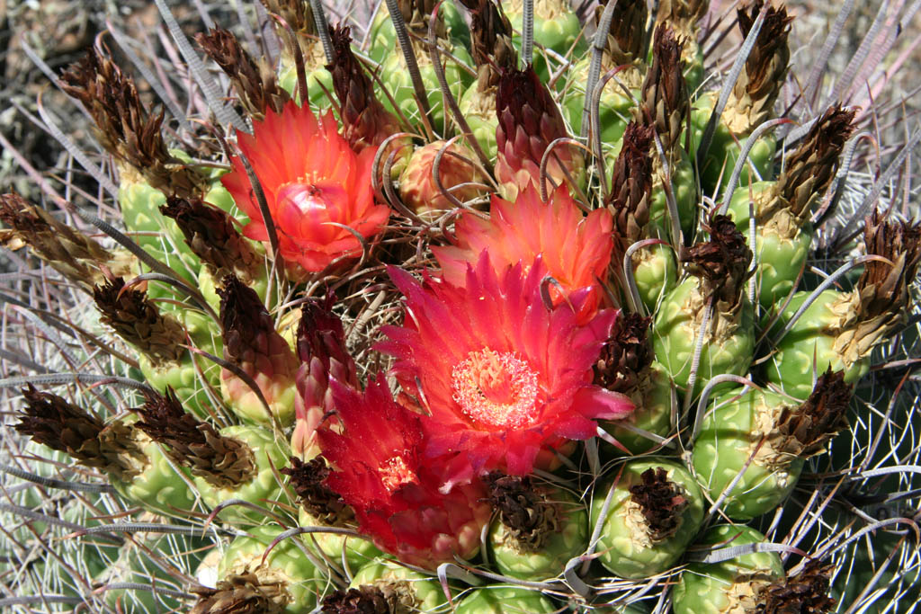 A few more blooms on a barrel cactus provide some color.